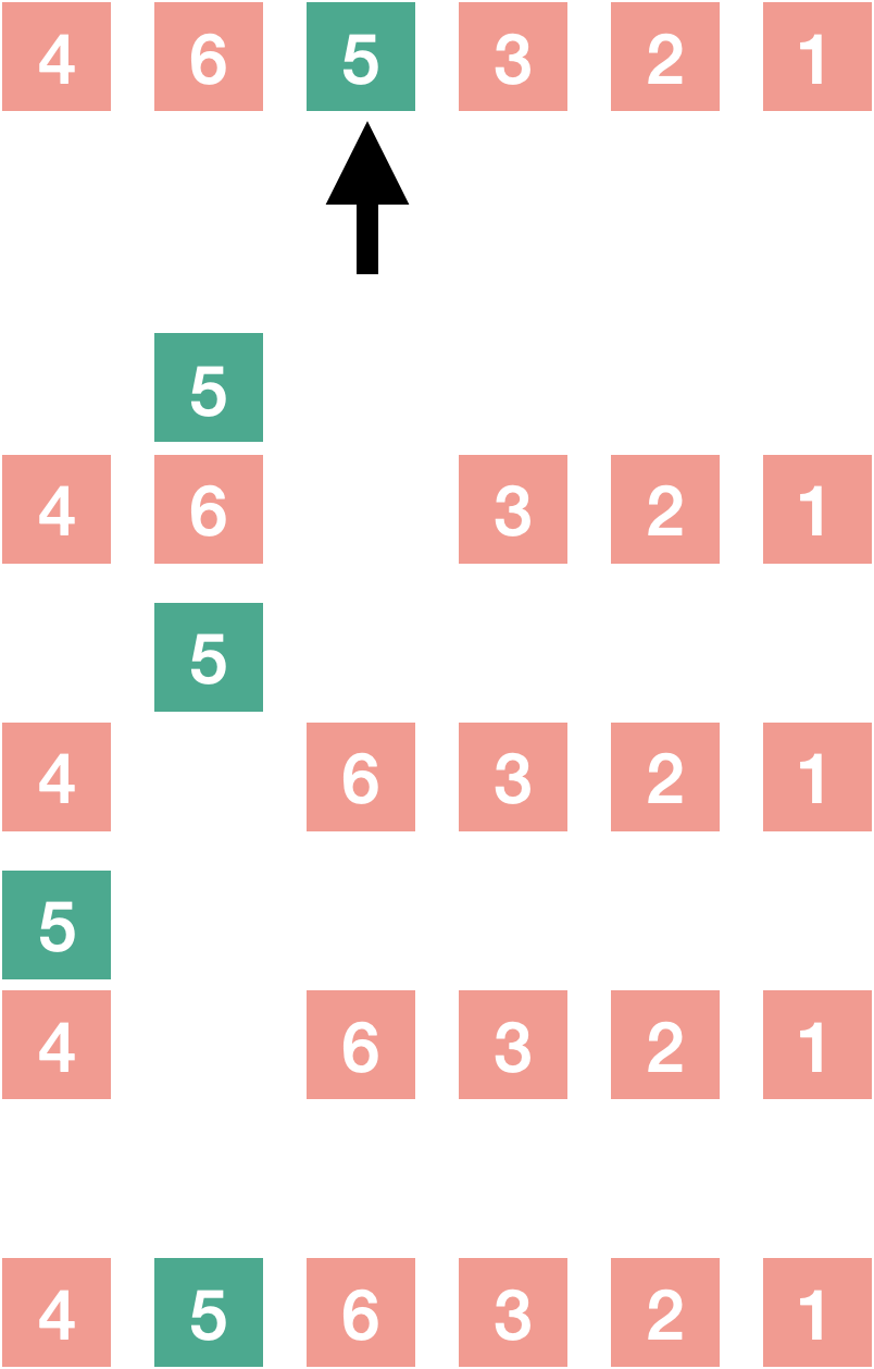 void insertionSort(int arr[], int length) { int temp = 0; int minIndex = 0; for (int i=1; i < length; i++) // 첫번째 원소는 비교 대상이 없기 때문에 두번째 원소부터 비교합니다. { temp = arr[i]; minIndex = i; // for (int j= i - 1; j>=0 && arr[j] > temp; j--) // { // arr[j + 1] = arr[j]; // minIndex = j; // } int prevIndex = i - 1; // 현재 비교 위치 while (prevIndex >= 0 && arr[prevIndex] > temp) { // 현재값의 인덱스가 0보다 크고, 비교값보다 크면 다음 인덱스로 삽입합니다. arr[prevIndex + 1] = arr[prevIndex]; minIndex = prevIndex; prevIndex--; } arr[minIndex] = temp; // 반복문이 종료되면 마지막으로 삽입 된 값의 인덱스에 비교값을 넣어 줍니다. } }Time Complexity of Insertion Sort